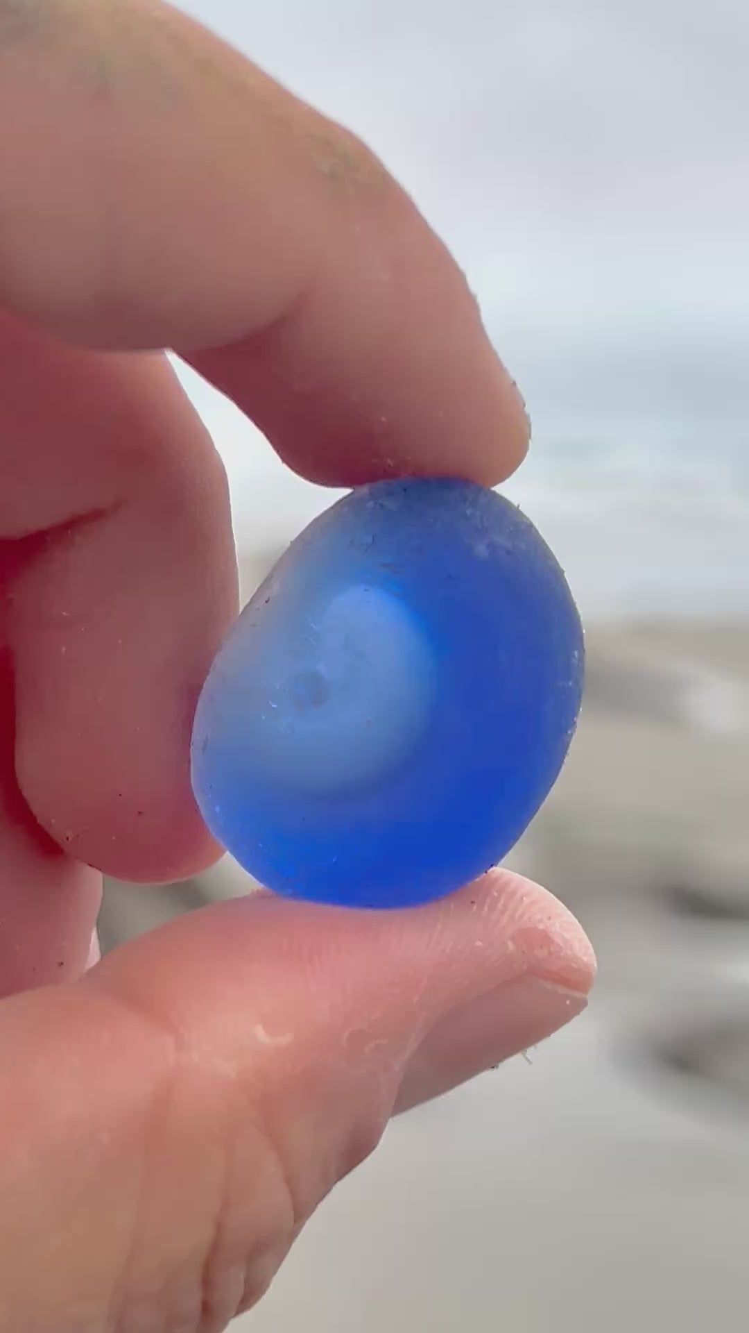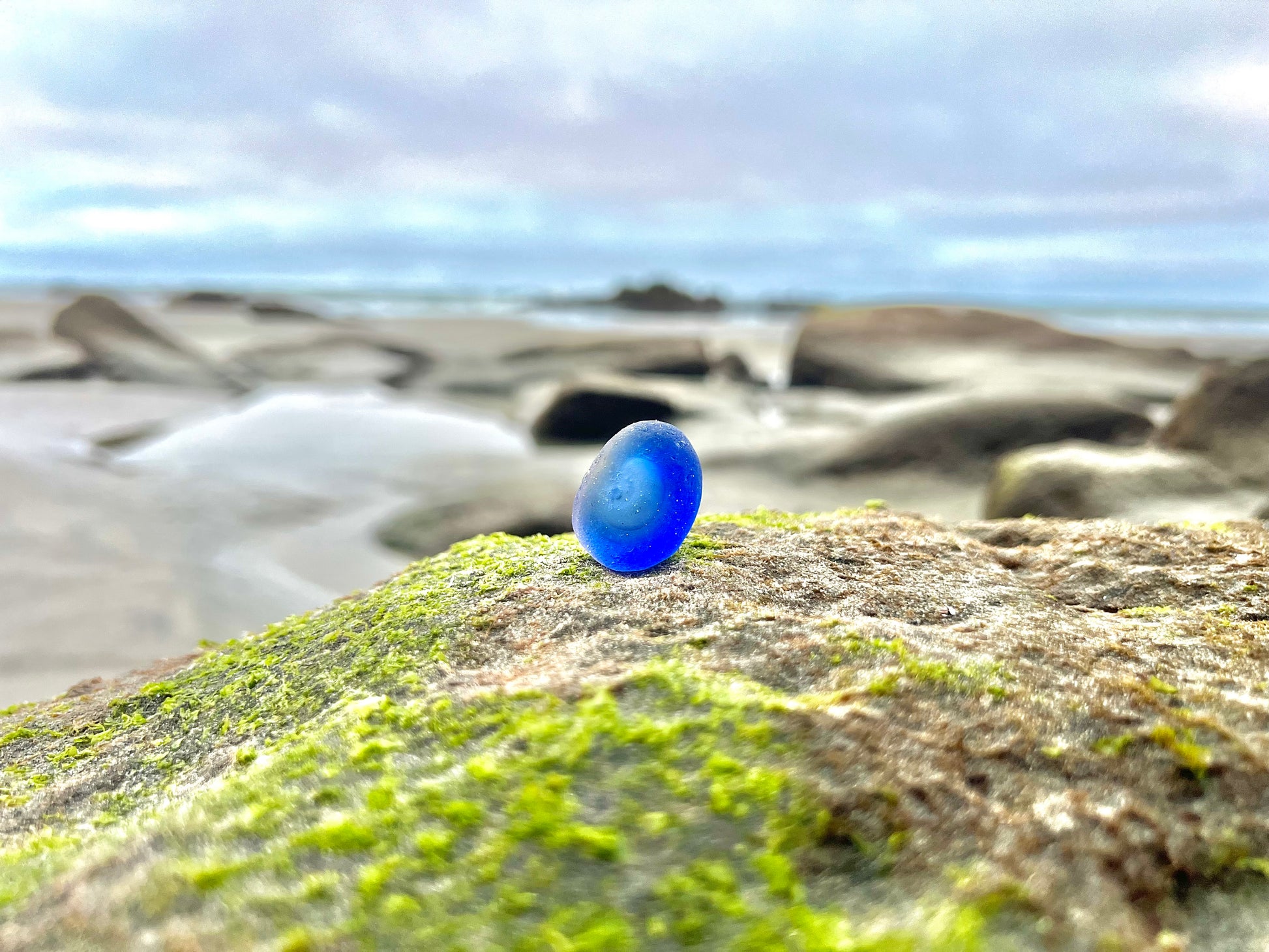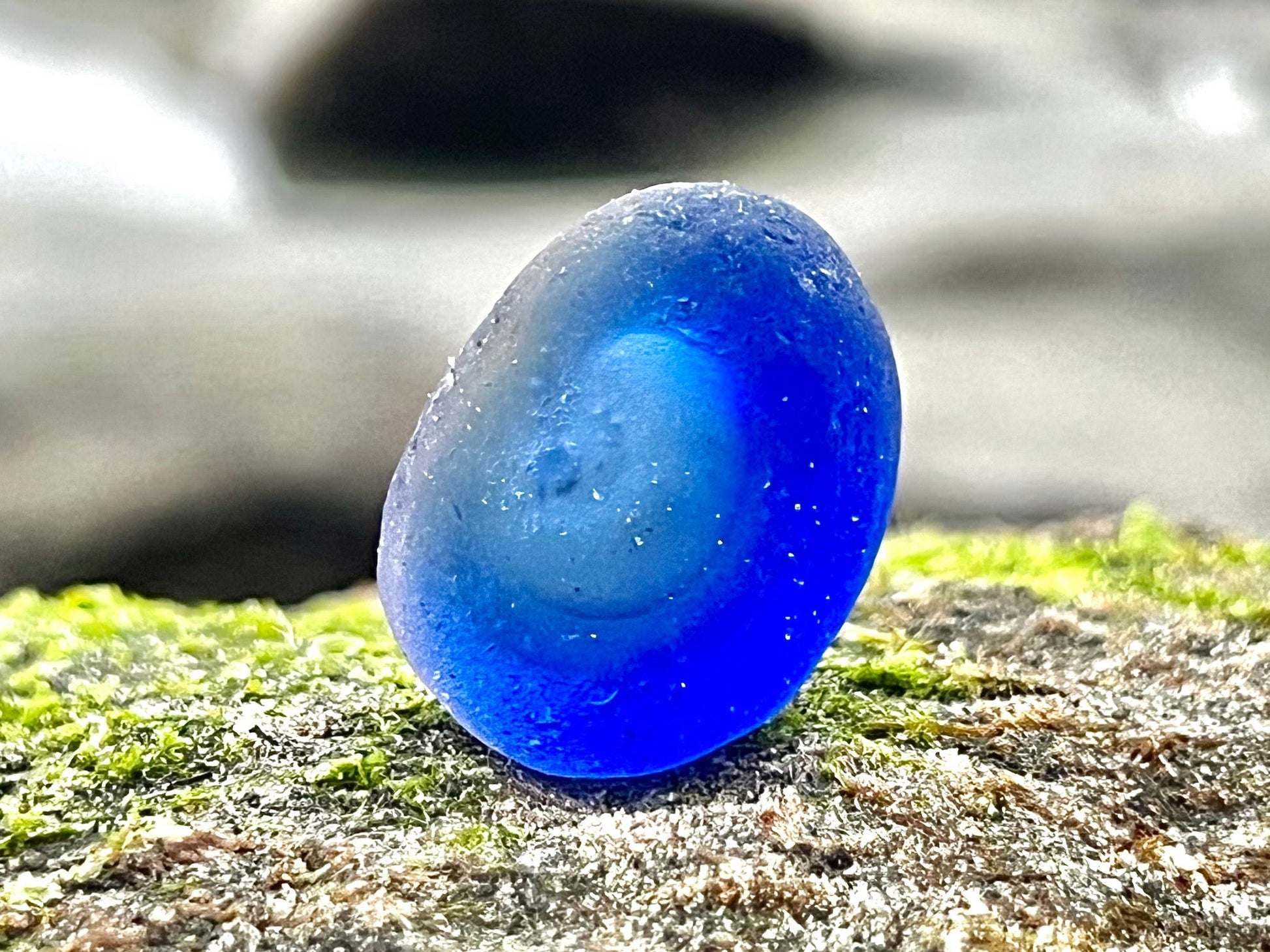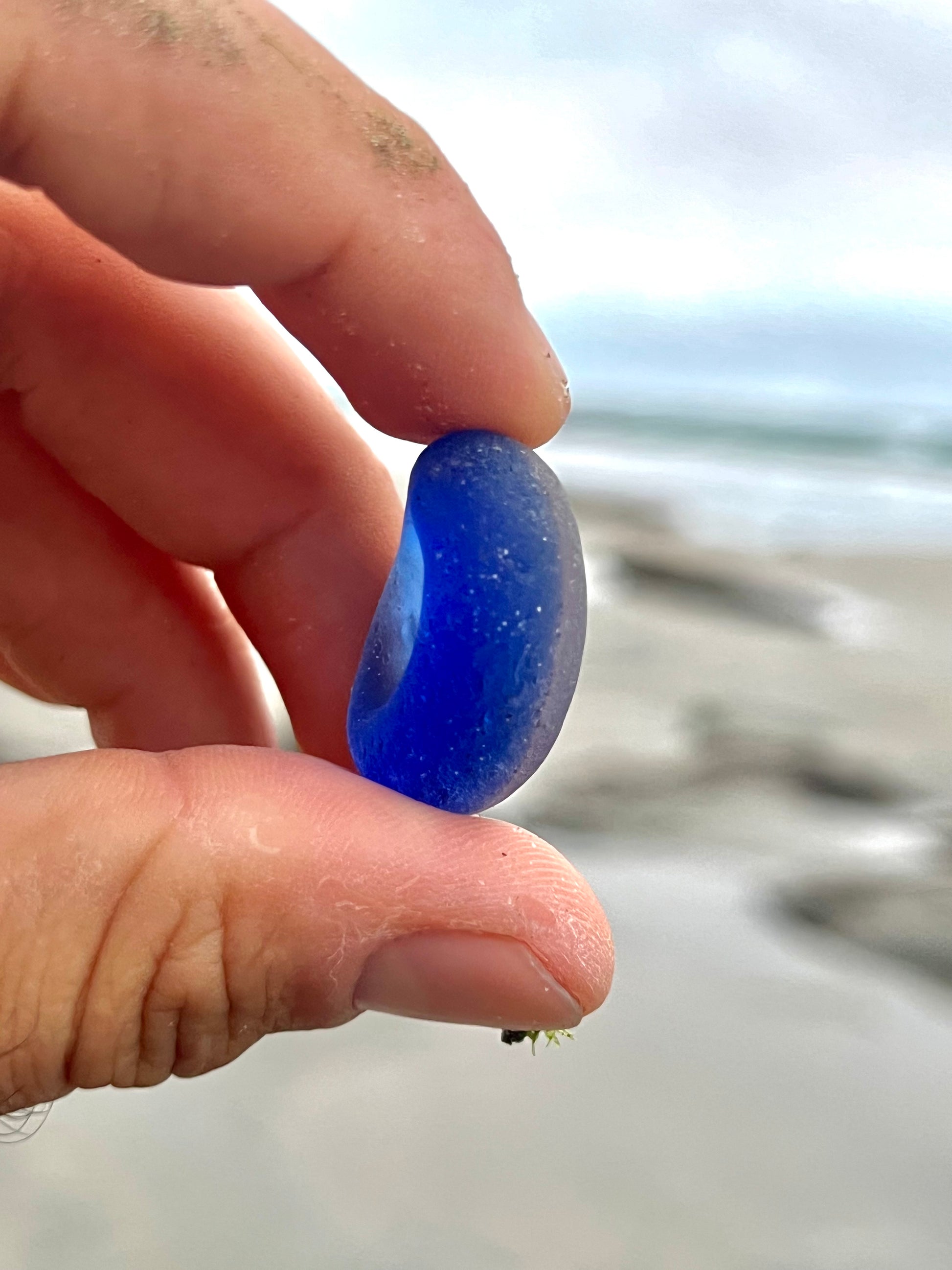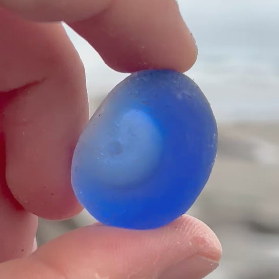 I will never forget the day that I found this amazing piece of blue sea glass. At first I thought it was a regular cobalt… But when I picked it up, I realize that it was special. It has a small divot on one side, indicating that it may have been part of a bottle bottom or something similar. There is also a layer of clear glass on one side, making this piece, a beautiful and rare multi.