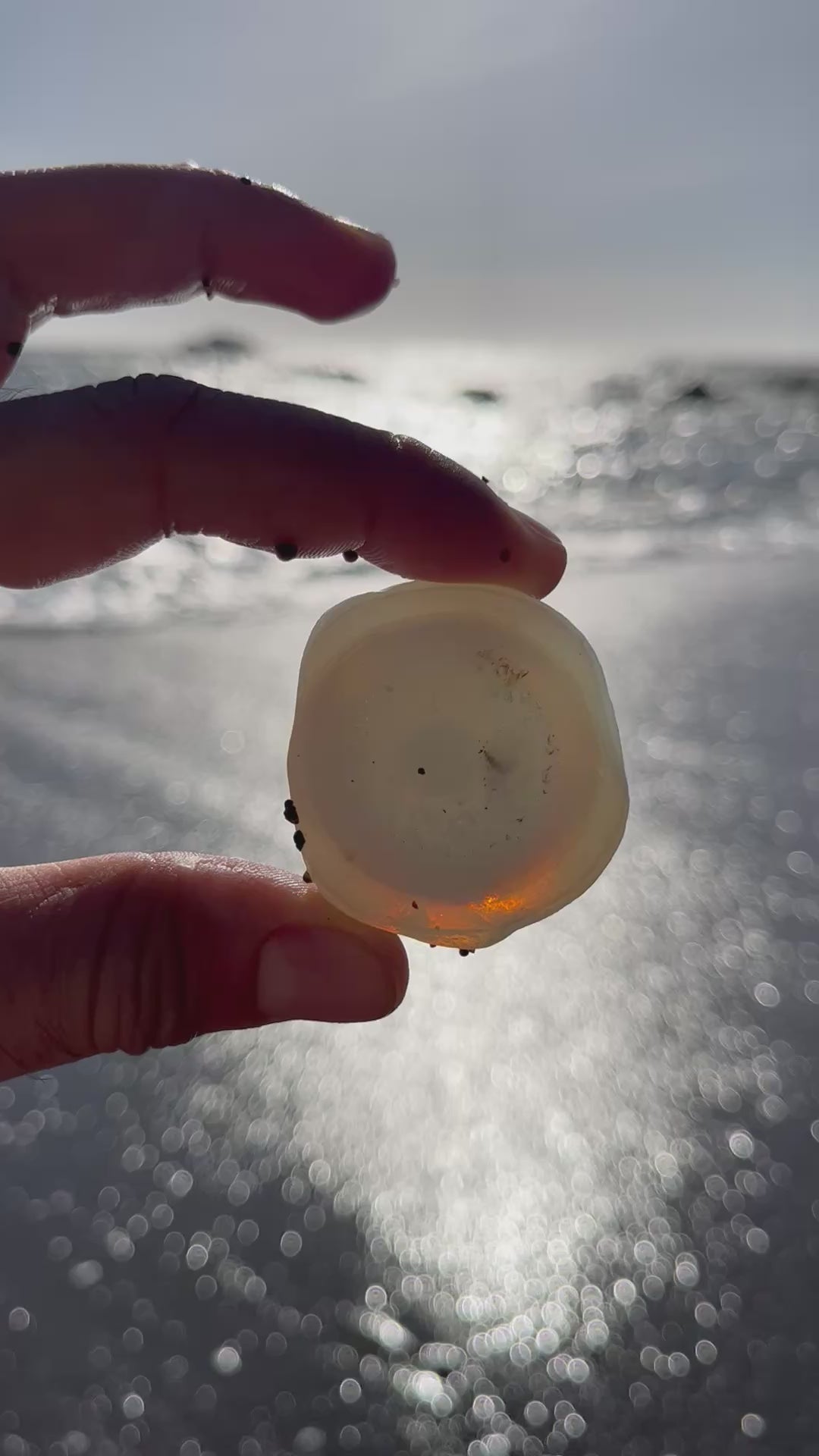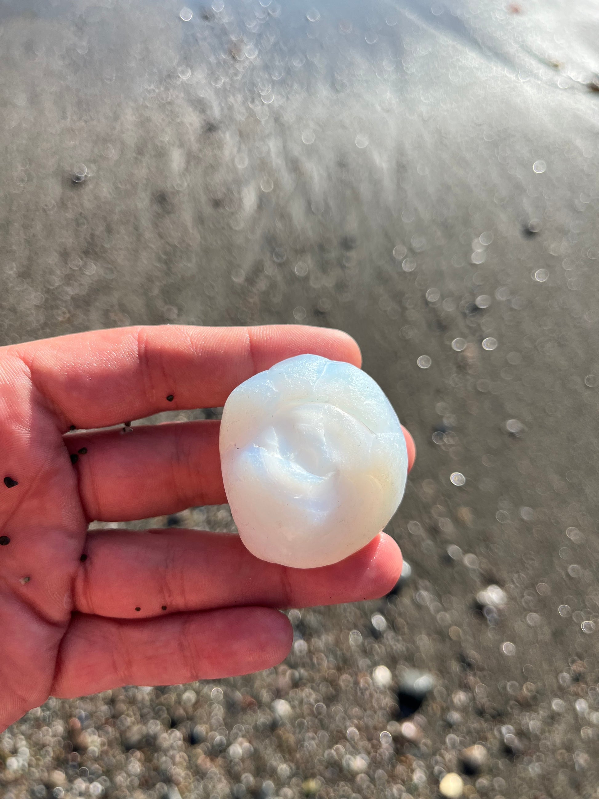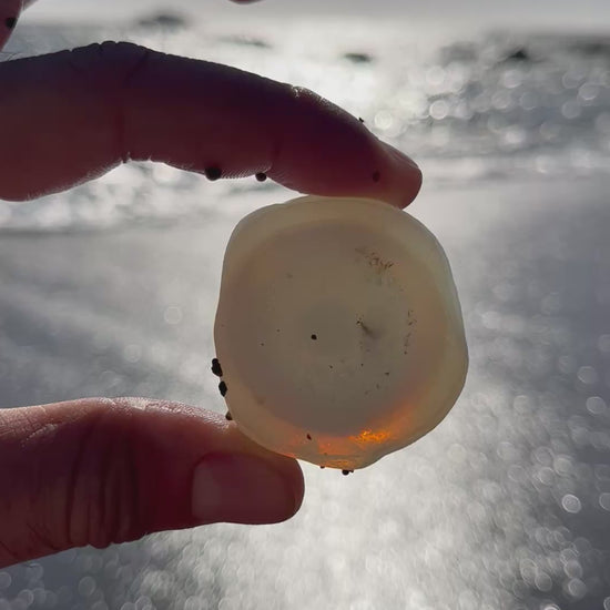 This is an incredible piece of Seaglass. Layers of opalescent glass wrap around each other to form what beachcombers call an eyeball. This piece comes from the famous Davenport cove, which is a very small Cove in Northern California where multis wash up. You can no longer find pieces this size there. Very rare