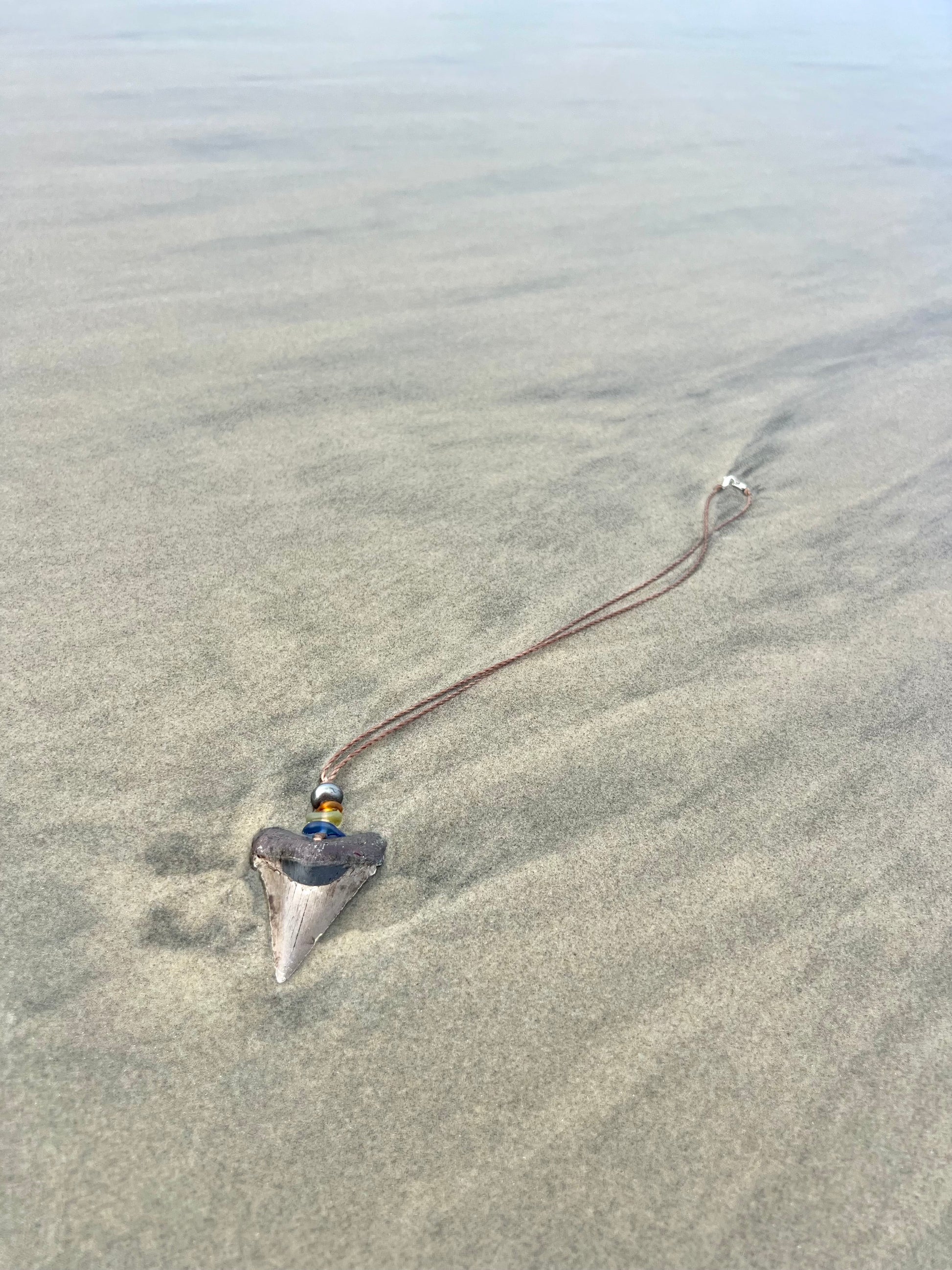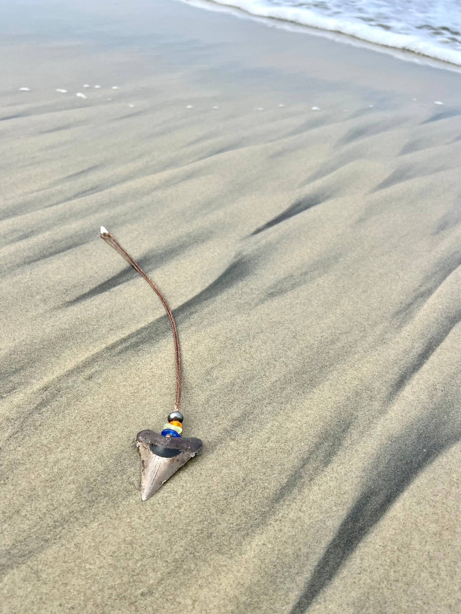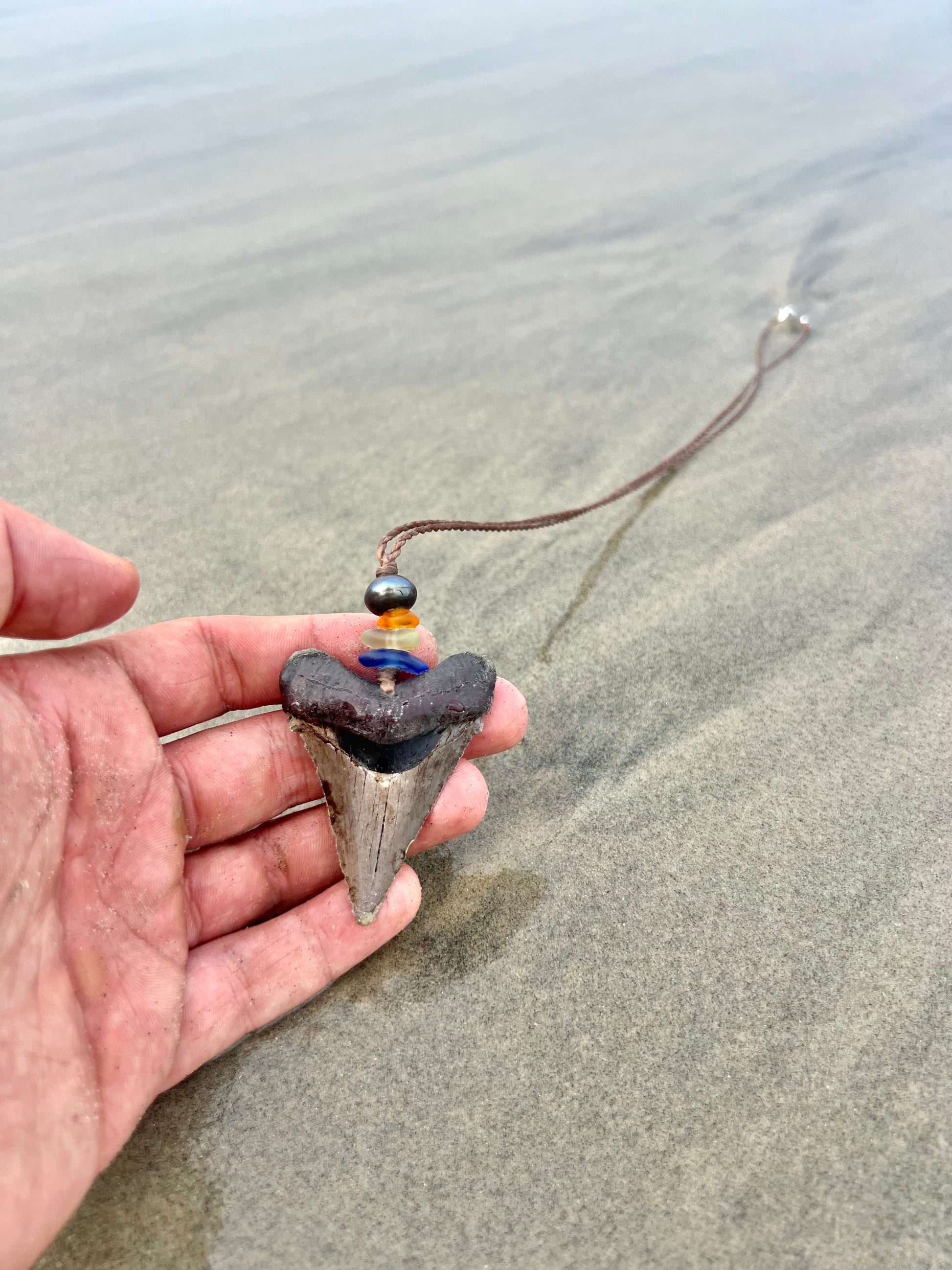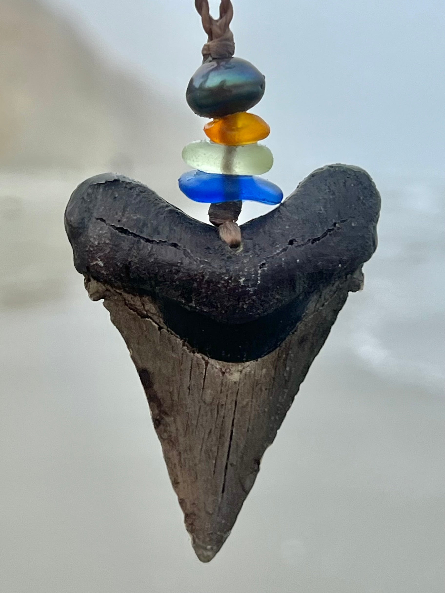 It features genuine California sea glass, a lustrous black pearl, and a dramatic centerpiece—a museum-quality replica of a megalodon shark tooth. Though not a real fossil, the tooth is a highly detailed, durable reproduction that captures the awe of the ancient ocean predator.