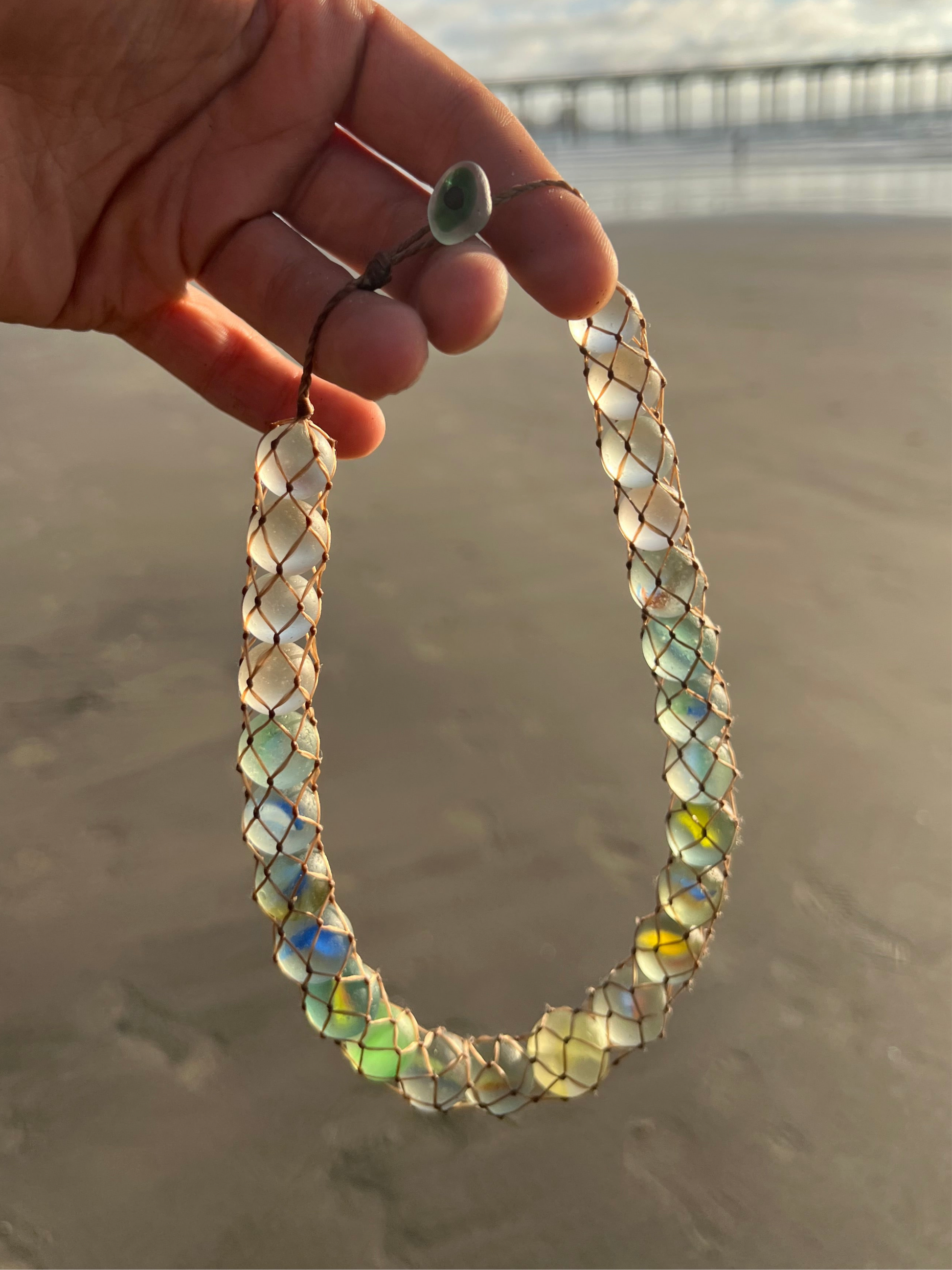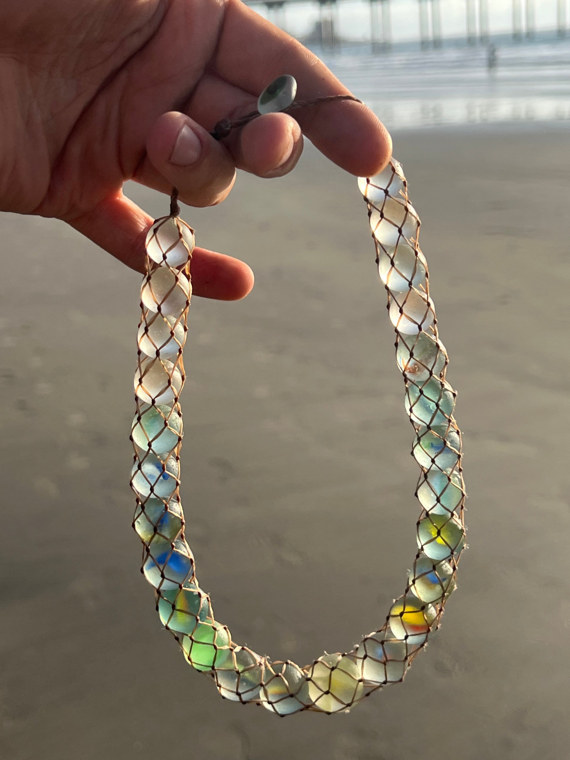 This is the Magnum Opus of my sea glass jewelry creations. 25 genuine sea glass marbles, all found on the same cove…woven into a statement necklace that is truly a beachcombing crown jewel. Hundreds of hand tied knots securely hold these rare ocean treasures in place. The clasp is made with a flawless English multi, from an old time collector who passed her amazing collection to me.